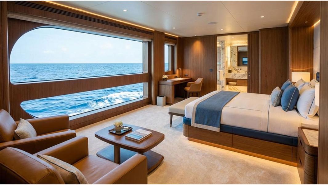 Spanning seven decks, the vessel can accommodate up to 100 guests in addition to the owner, each provided with generous spaces and a diverse array of amenities. The yacht also supports a crew complement of up to 40, housed in high-quality quarters featuring en-suite cabins and a spacious crew mess for comfort during extended voyages.